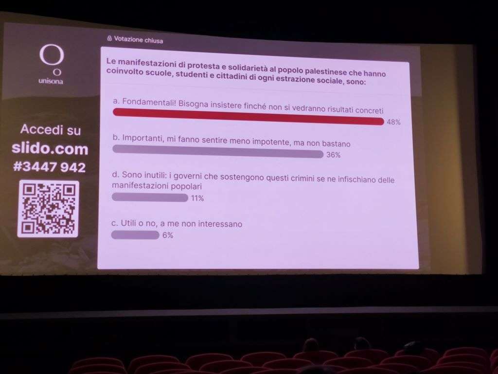 Ci siamo trovati davanti a un documentario che raccontava la cruda realtà di quello che sta accadendo a pochi passi da noi. Immagini forti che mi hanno fatto soffermare e pensare. Ci sentiamo molto lontani rispetto alle immagini e testimonianze che abbiamo visto, dato che non le viviamo in prima persona ma è importante ricordare, mostrare e fare capire a più persone possibili che questa realtà non è così lontana da noi. Allo stesso tempo dobbiamo ricordare come non è solo in Palestina questa situazione così toccante, ma anche molti altri paesi si trovano in queste situazioni difficili. E’ importante far sentire la propria voce proprio sulla questione e credo che il film di oggi abbia lasciato un segno in tutti noi!